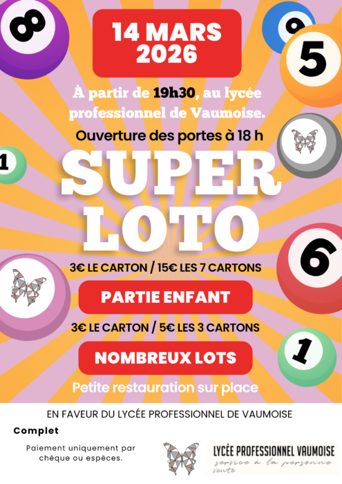 L’établissement organise un super loto le 14 mars 2026 à partir de 19h30 au Lycée Professionnel de Vaumoise. De nombreux lots sont à gagner ! Ce loto sera organisé et animé par les élèves, dans le cadre de leur formation et de leur diplôme.