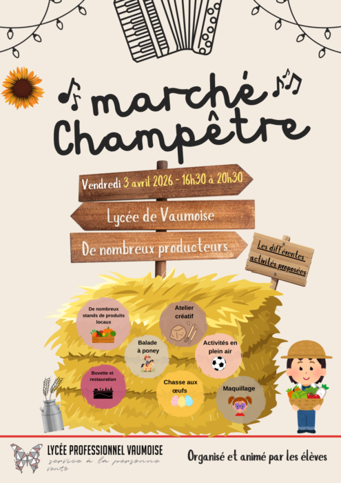 L’établissement organise un marché champêtre le vendredi 3 avril 2026 de 16h30 à 20h30 au Lycée Professionnel de Vaumoise. De nombreux producteurs et artisans locaux seront présents pour vous faire découvrir leurs produits 🧑🌾. Plusieurs activités seront également proposées pour petits et grands 🎉. Nous vous attendons nombreux pour partager un moment convivial au sein du lycée 😊