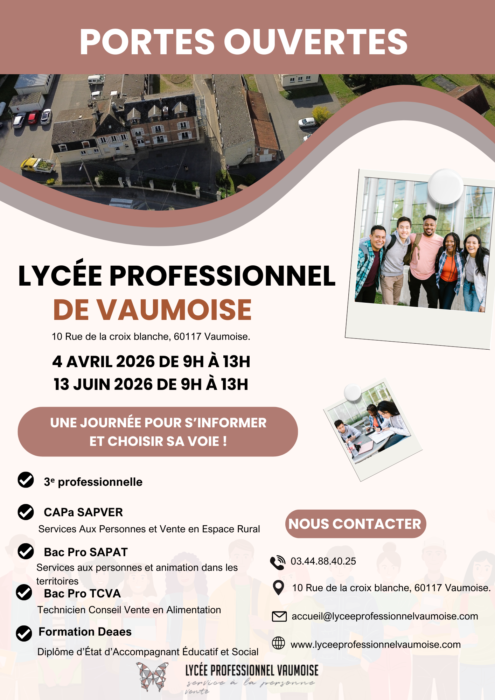 Le Lycée Professionnel de Vaumoise organise ses portes ouvertes le 4 avril 2026 de 9h à 13h30 📅 ainsi que le 13 juin 2026 de 9h à 13h30 📅.