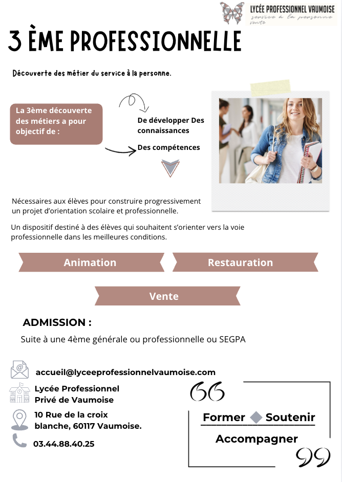 La troisième professionnelle « Découverte des Métiers » permet aux élèves de découvrir divers secteurs professionnels et d’explorer leurs intérêts et aptitudes avant de choisir une spécialisation.