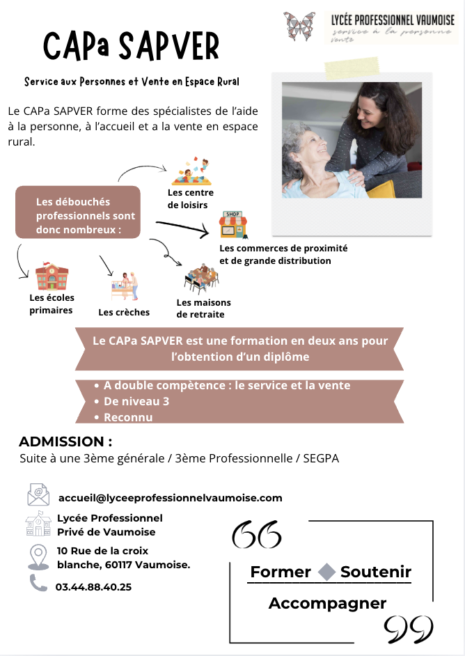 Le CAPa SAPVER (Services Aux Personnes et Vente en Espace Rural) forme les élèves aux métiers du service à la personne et de la vente, en mettant l’accent sur les spécificités des milieux ruraux et périurbains.